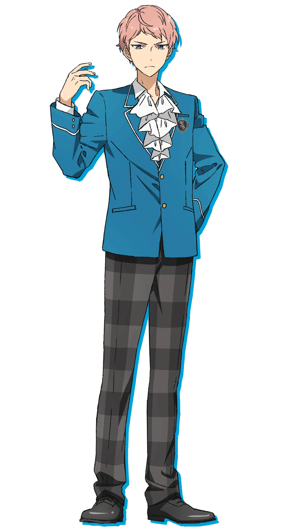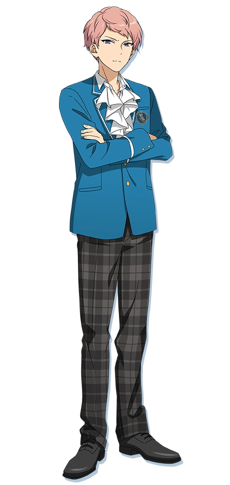 Shu is a very tall young man with a good build. He has short, light pink hair that is slightly tousled. He wears the school's uniform with the white shirt undone at the collar and a jabot over the blazer. His jacket is buttoned up nicely. He wears black loafers and loose plaid pants.